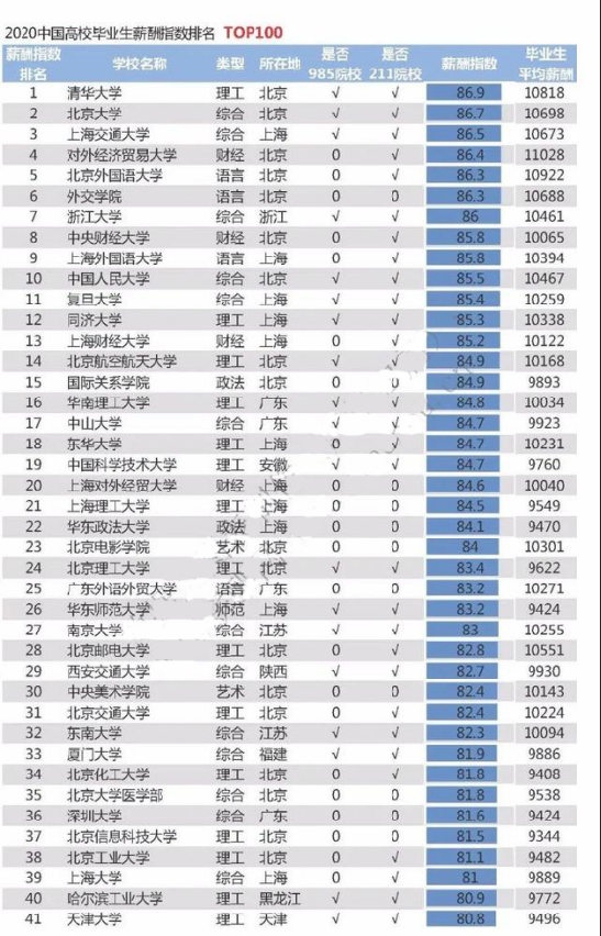 2020中国高校毕业生薪酬指数排名top100里,可以看到,即使是顶级的985,平均薪酬也只在10000元左右。
