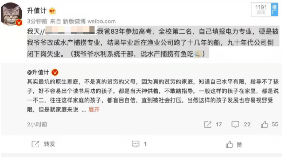 升值君有个粉丝,他爸83年参加高考,全校第二名,自己填报电力专业,硬是被他爷爷改成水产捕捞专业。爷爷的理由是水产捕捞能有鱼吃,饿不死。结果毕业后在渔业公司跑了十几年船,90年代公司倒闭下岗失业。