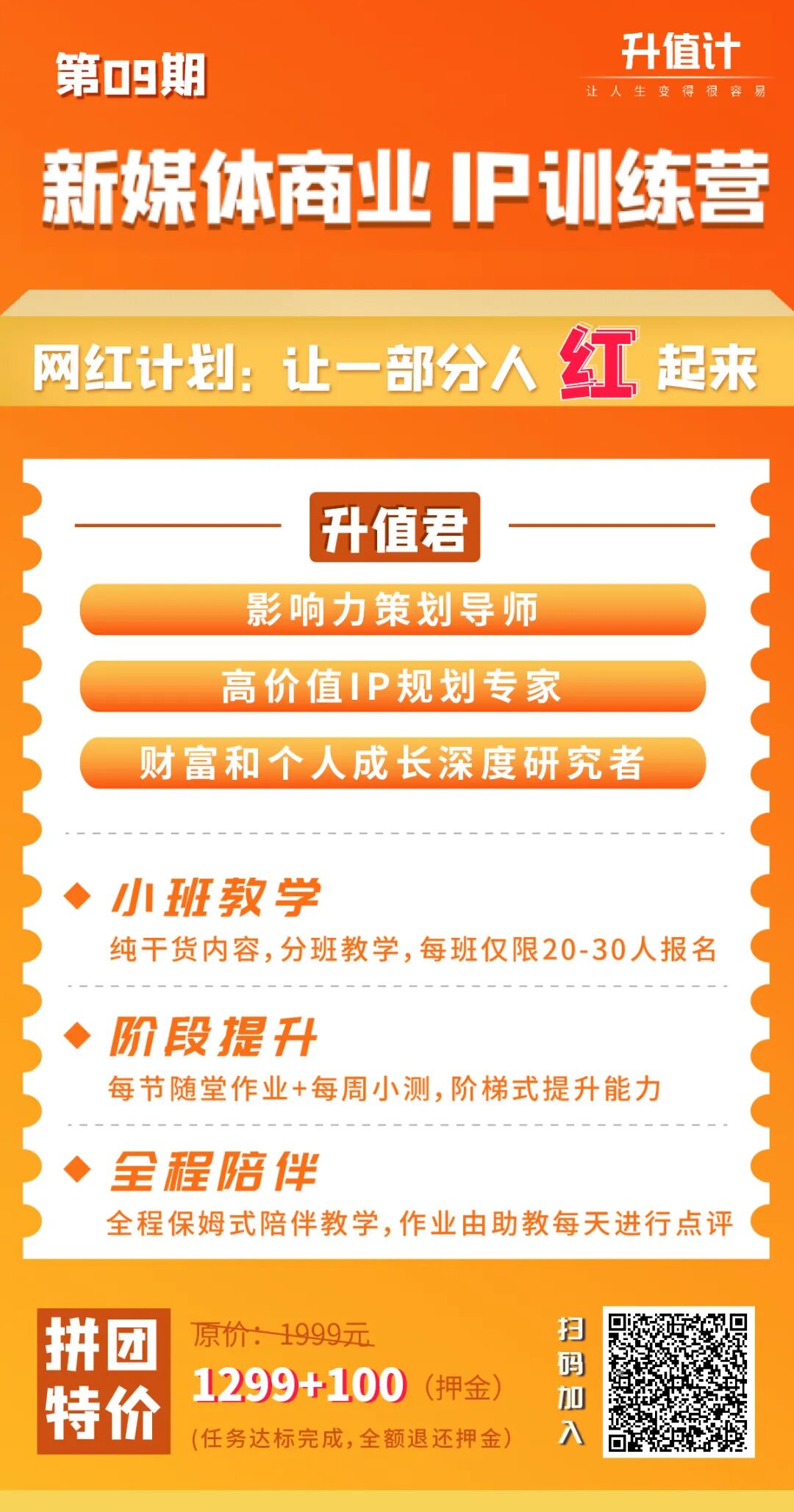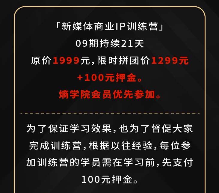 1. 《新媒体商业IP训练营》09期,原价1999元,限时拼团价1299元+100元押金,