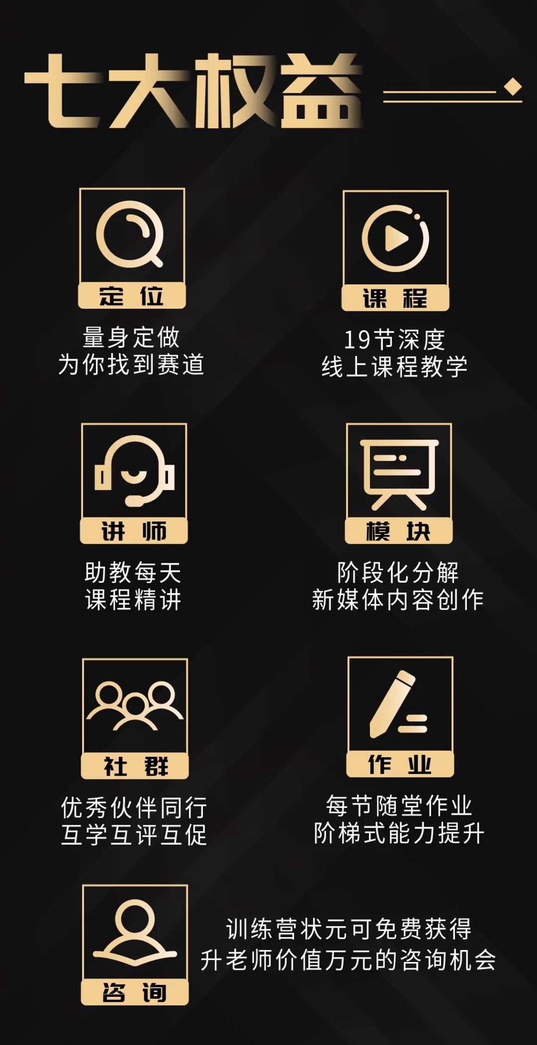 作为资深自媒体人,经过几年的钻研,通过线下讲座,和线上课程迭代打磨,把自己新媒体的经验浓缩成19节课,21天训练营。