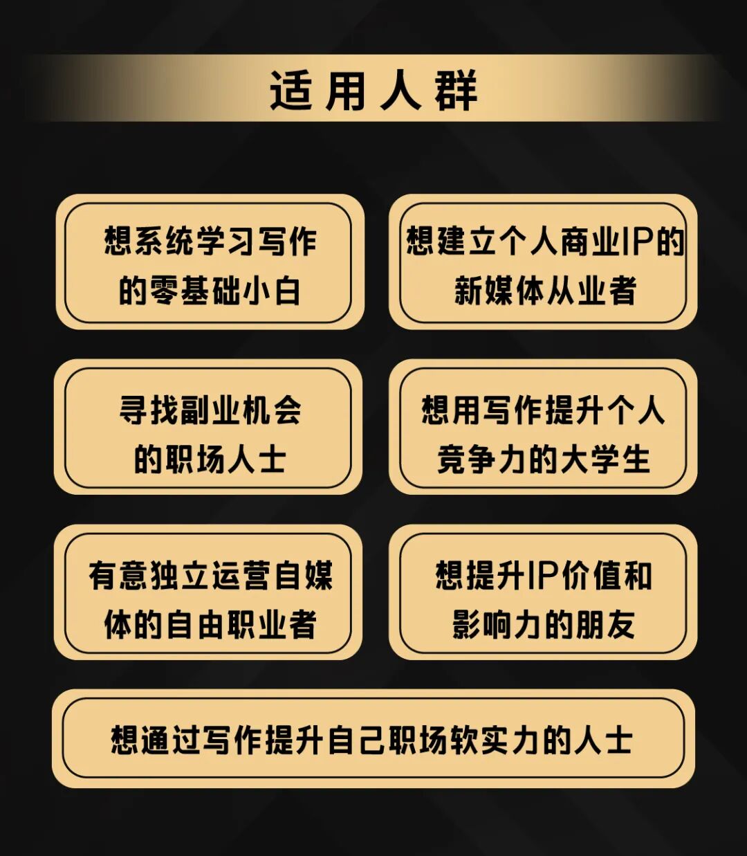 不同于一般写作课,我们的课程,不单单只教授具体的写作方法,更重要的是教大家商业IP意识培养,教产品经理思维,这才是做自媒体的核心所在。既教你如何写出来,又帮助你运用IP思维将自己的产品推出去。