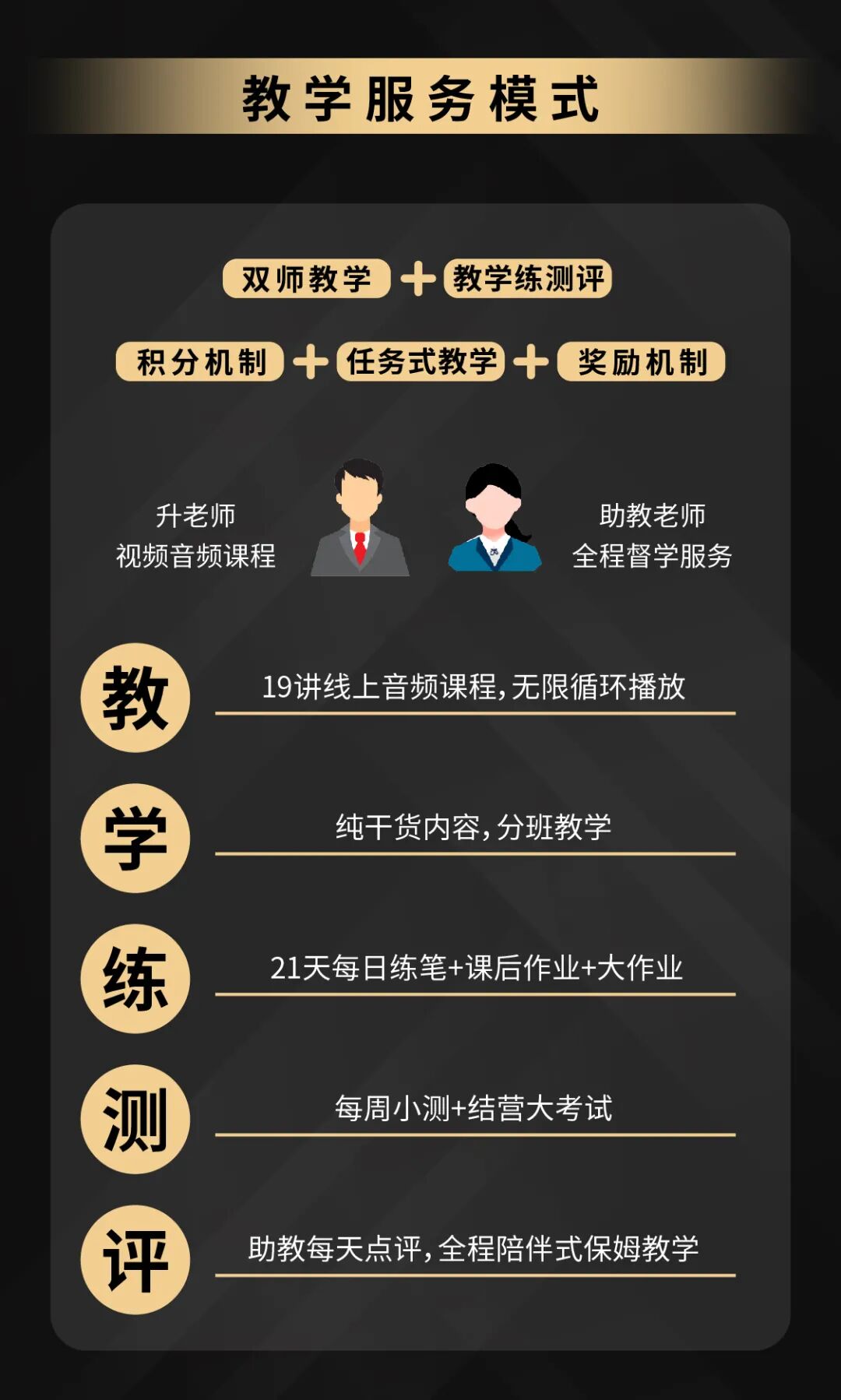 「教学练测评」五维成长模式,每天都有作业,帮你在这21天里,养成持续输出的好习惯。