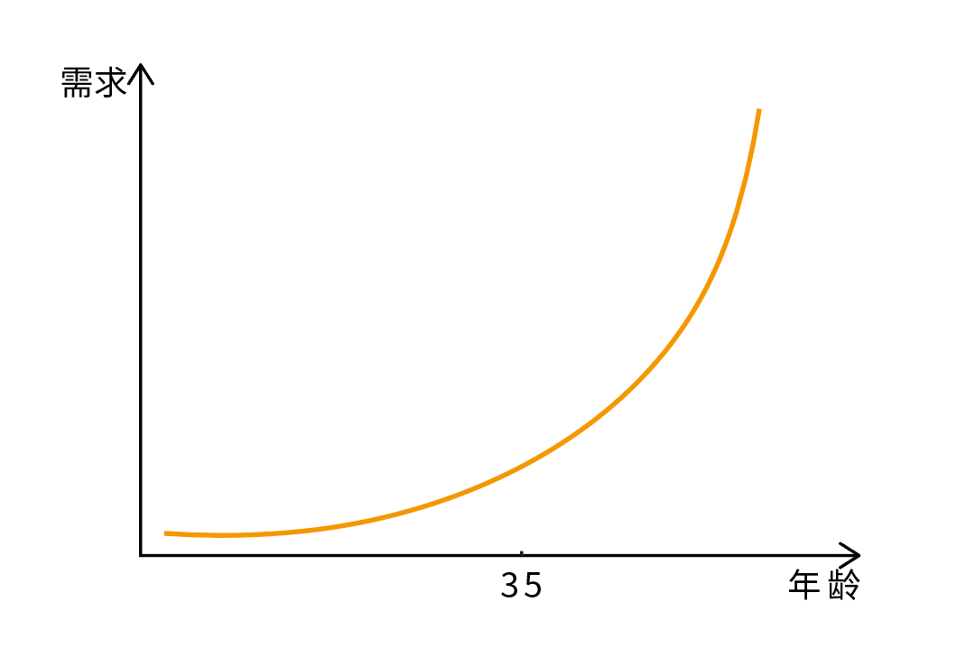 如果两张图重合,会发现收入曲线完全无法覆盖上需求曲线,因为到了35岁这个节点,几乎所有职场人的事业开始进入瓶颈期,而几乎所有家庭的需求曲线,从这时候开始,进入一个高速增长期,因此,有一个叫「35岁职场危机」的词广为流传。