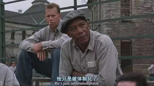 电影里那个叫布鲁克斯的老人,十几岁就被抓进监狱,一呆就是50年,这个别人视为囹圄的地方,逐渐成了他的体制内,等他到了监狱外边,他不适应外界的生活,被迫举刀杀人想重新关进监狱,可惜70岁连犯罪能力都没有了,只能自杀。