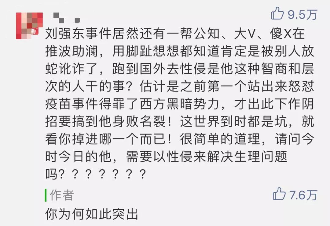 对于所有性侵事件,网民都有一种很不好的习惯,往往有一种声音,不是谴责加害者,而是揣测受害者,「穿得骚怪谁?」「还不知道怎么回事呢。」刘强东性侵门也是如此,事情刚出来,中国曾经的首富之子王思聪就以通晓内情的语气说,「应该是价钱没谈妥」,随后对明州女孩的恶意揣测就铺天盖地而来,「外围」,「竞争对手的套」,「仙人跳」「这么有钱怎么可能强奸」,甚至是华尔街幕后黑手,各种阴谋论四起,这些狂欢的人眼里,有钱就是无罪,性侵了也是假的。