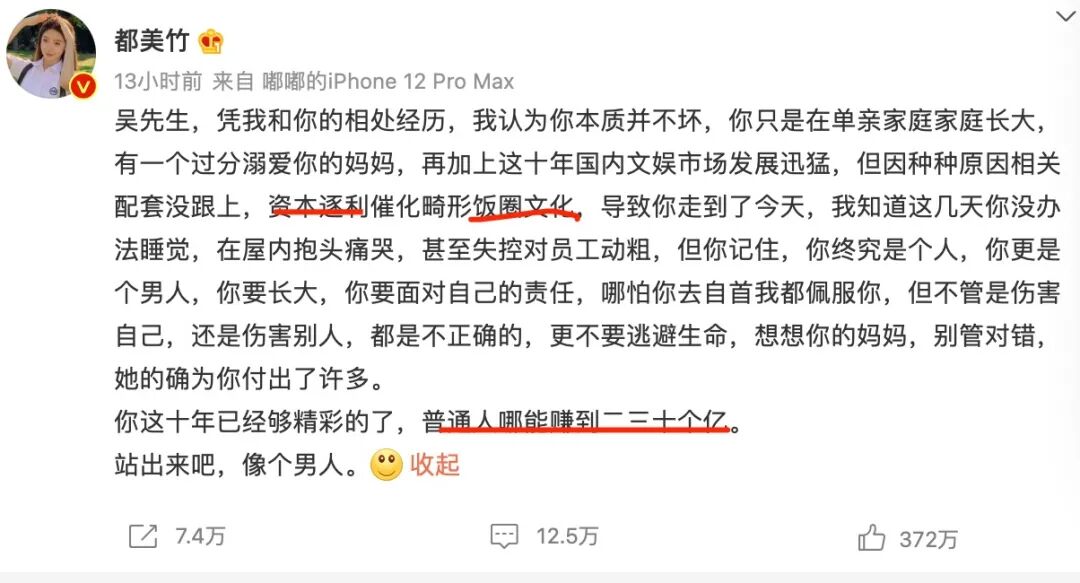 如果说前面这些,你都没有上头,但是当看到十年20亿的时候,我相信,无数人已经掏出了计算器。我们都知道,明星赚的多,但是我们不知道,明星赚这么多,而且全部打到痛处,全是关键词,资本、饭圈畸形,字字打在普通人的痛点上,而且都是观众早已深恶痛绝的东西。