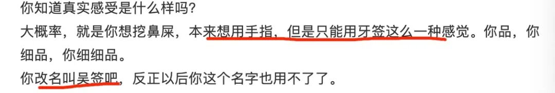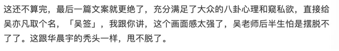 如果仅仅是八卦就算了,关键是她的描述还极具画面感。直接给吴亦凡取个名,「吴签」,昨天微博升值君分析了,这个画面感太强了,吴老师后半生怕是摆脱不了了。这跟华晨宇的秃头一样,甩不脱了。