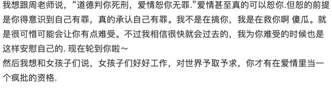但是,她的焦点完全模糊,她想告诉这些女孩,我很独立,对世界予取予求,可以做个疯批,暗示自己有钱,但是,我相信一半读者没有领会,而且完全被她前面矫情的文字冲淡了,失败,完全的失败。