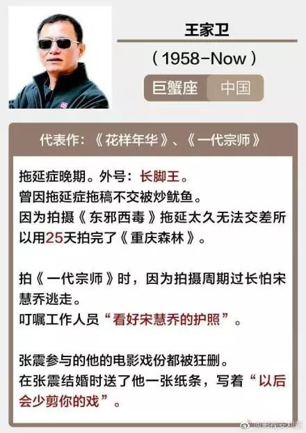 乔治马丁不是唯一一个重度拖延症晚期患者,著名导演王家卫有个外号,「长脚王」,曾经因为拖稿不交被炒鱿鱼,他的《2046》一共拍了5年,《一代宗师》筹备13年,拍摄用了3年,生怕当时的韩国演员宋慧乔受不了他的拖延症逃跑,王家卫反复叮嘱工作人员,一定要「看好宋慧乔的护照」。