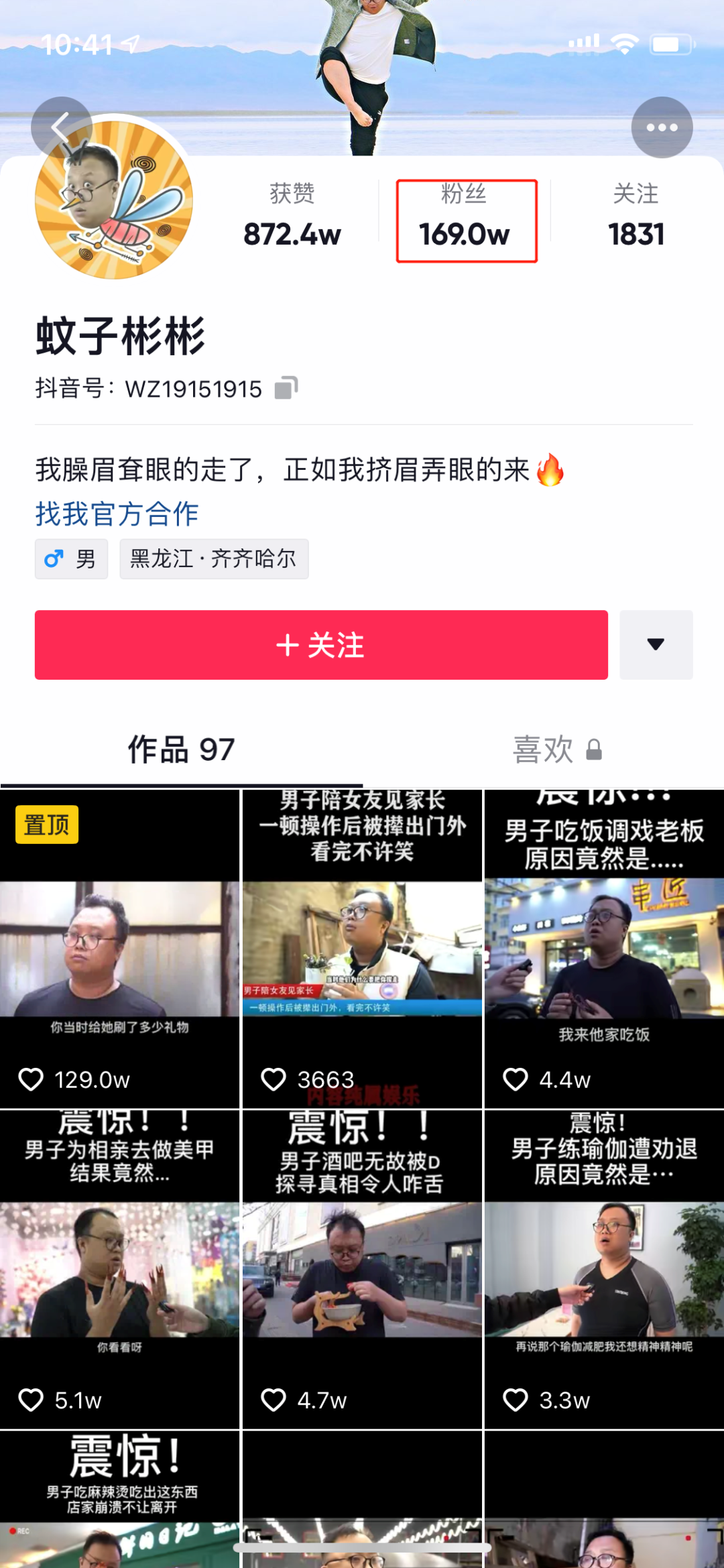 抖音169w粉丝,幽默表演号,走的是装疯卖傻路线。