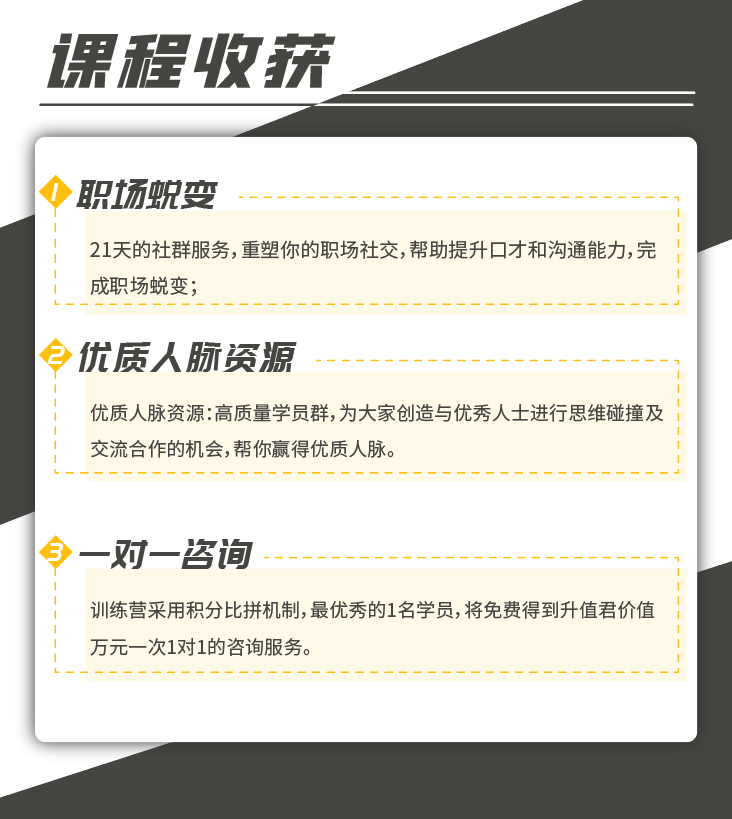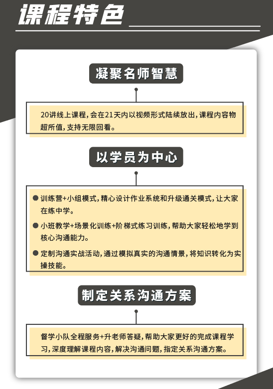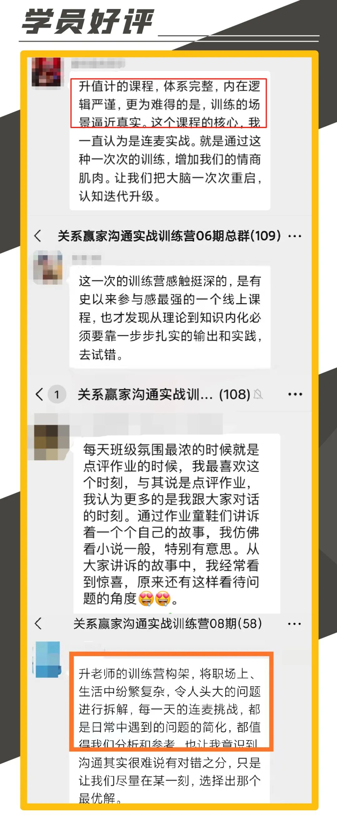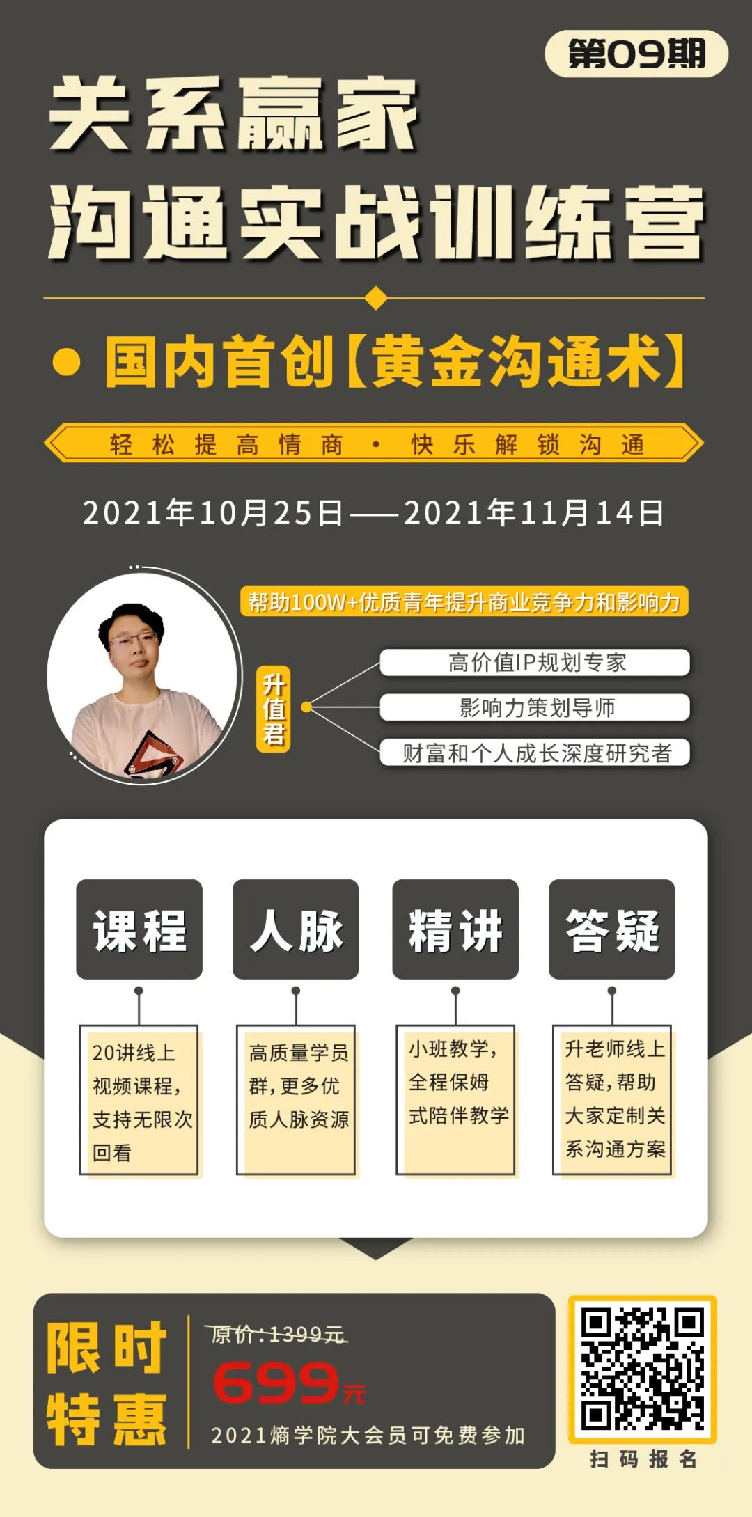 我真的建议,所有想在事业和家庭上取得成功的人,都能训练一下自己处理关系的能力,我的《关系赢家沟通实战训练营》第09期,就是给大家提供这样一个沟通实战训练的平台,教大家利用沟通连接更多资源,搞定关键关系,教大家一些高质量社交关系的维系技巧,为自己人生升值。