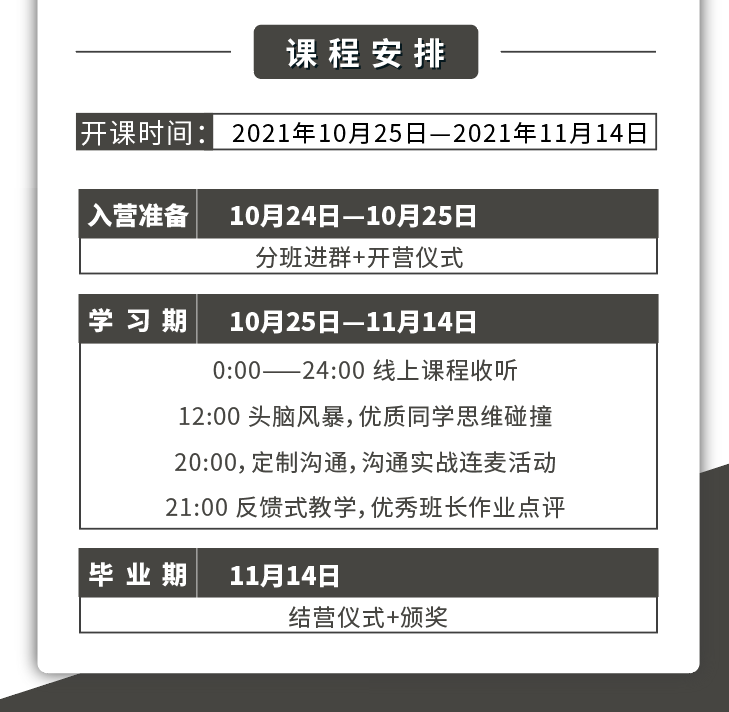 《关系赢家沟通实战训练营》第09期,一共21天课程,开营时间为2021年10月25日—11月14日,通过线上授课+社群互动的形式,用21天时间帮大家搞定关系这件事。