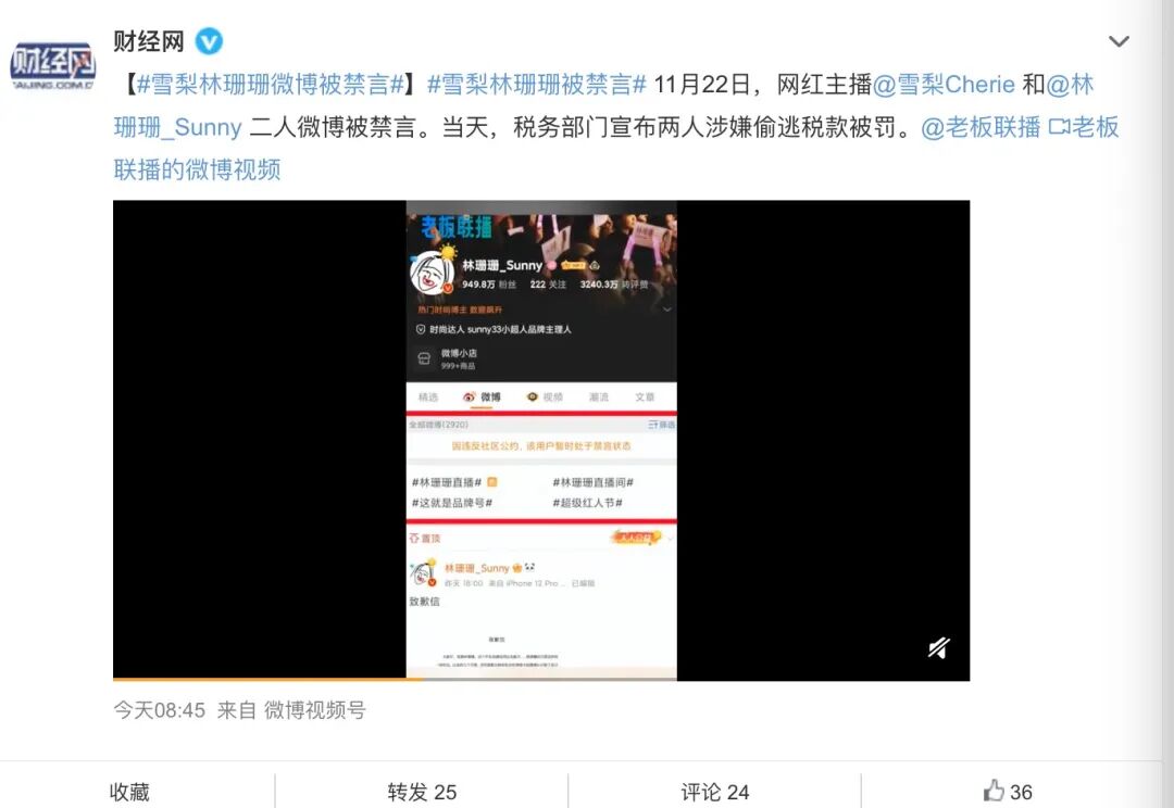 再看昨天的新闻,两个大主播,雪梨和林珊珊涉嫌偷逃税款被罚,很快,两个网红主播的微博被禁言。