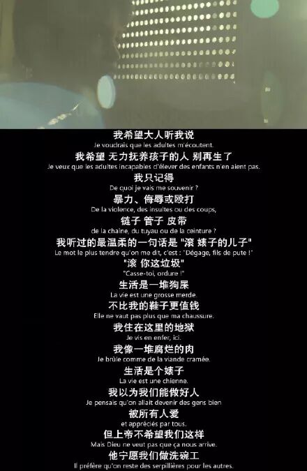 「我希望无力抚养孩子的人,别再生了。我只记得暴力、侮辱或殴打,链子、管子和皮带。我听说最温柔的一句话是「滚,婊子的儿子。」生活是一堆狗屎,不比我的鞋子更值钱,我住在这里的地狱,像一堆腐烂的肉,生活是个婊子,我以为我能做个好人,被所有人爱,但上帝不希望我们这样,他宁愿我们做洗碗工。」