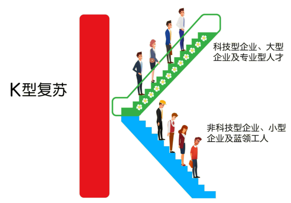 2008年诺贝尔经济学奖获得者保罗·罗宾·克鲁格曼,他在2020年提出一个概念,K型复苏,他认为现在世界正在经历K型复苏,世界的经济总体是一个K型,富人积累财富越来越容易,而穷人积累财富越来越难。