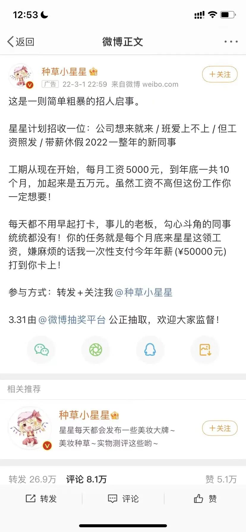 人家说的不是5w抽奖,是送一份5w的工作,一份不用上班,爱来不来,带薪休假,总之你可以躺平的工作。