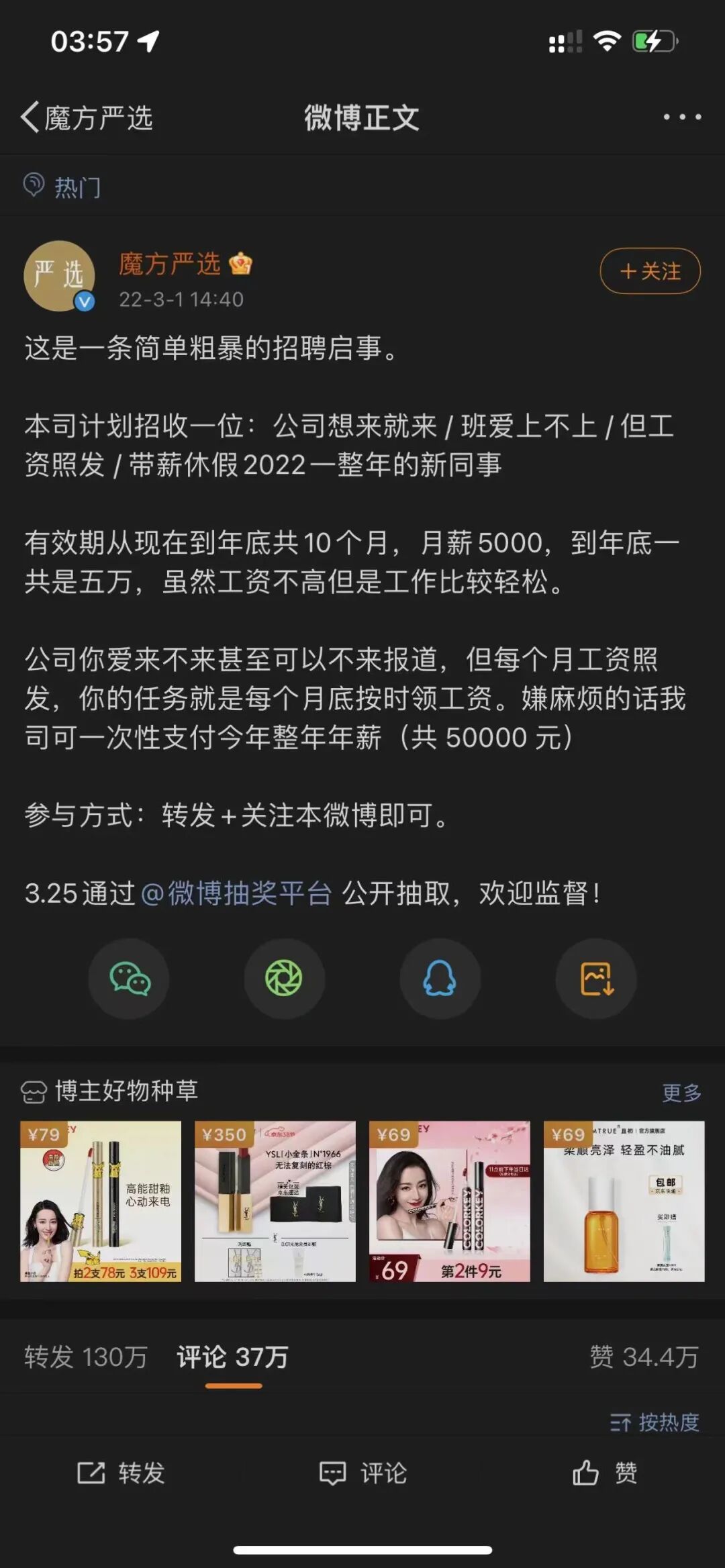魔方严选的会玩,不仅仅是把抽奖变成了招聘,还在于,一旦他把抽奖变成招聘,很多工作中的梗就可以玩起来了,所以他的微博变成了彻头彻尾的娱乐,引起了二次传播。