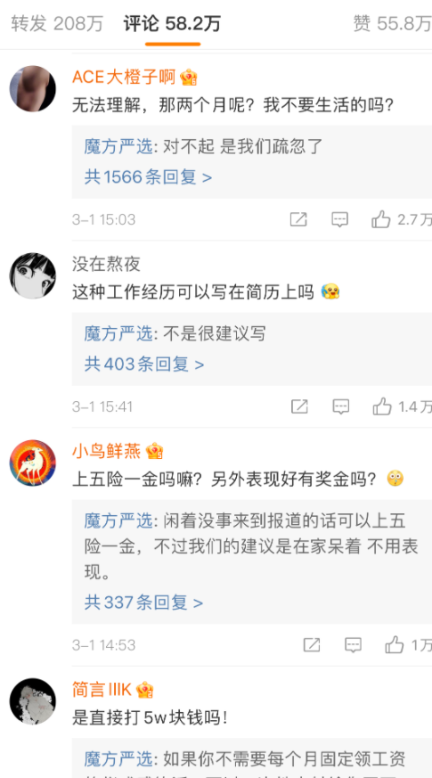 它的评论区,直接被大家玩坏了,有人得寸进尺,要剩下两个月工资,有人要五险一金,有人要写进简历。