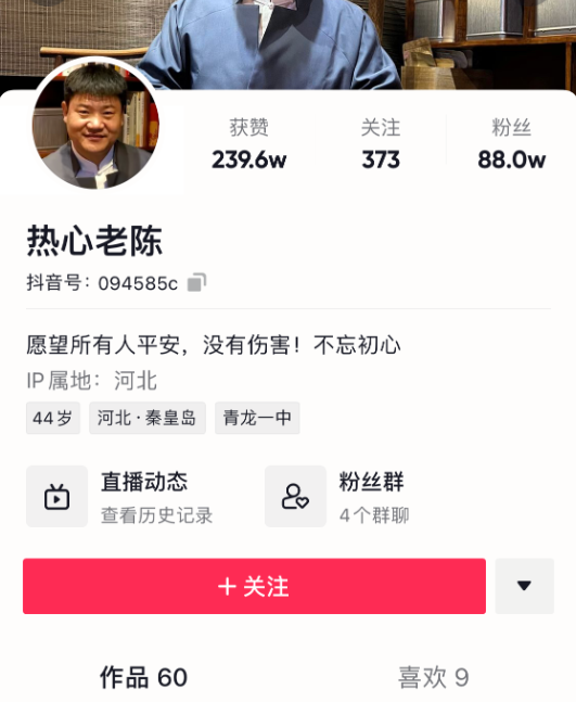 反诈警官老陈有500w粉丝,热心老陈0粉丝,即使有人给老陈打赏,也不是为他本人打赏,即使有人在关注他。