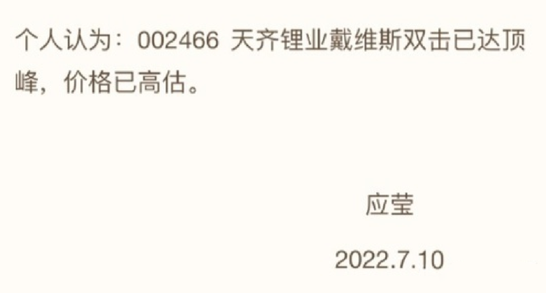 7月10号是个寻常的星期天,应莹发布了一条评论,涉及到中国锂王——天齐锂业。