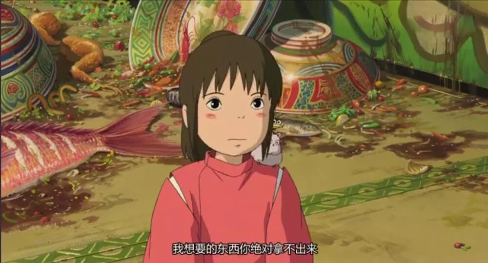 当作为成人的父母想要走捷径的时候,千寻反对;当父母在无人看守的餐馆大吃大喝的时候,千寻反对;当作为成人的青蛙都在油屋澡堂里为无面男的金子狂欢的时候,面对无面男掏出的金子,千寻说「我想要的东西你绝对拿不出来」。
