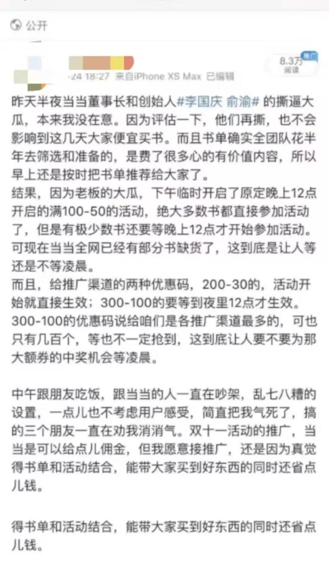 昨天两口子撕逼,很多人忽略了一件事,当当本来应该在25日零时开始的满减优惠提前开始了。这件事有什么影响呢?当当本来找了很多母婴和读书博主做推广,之所以找母婴博主,就是因为妈妈和主妇们是购买图书的主力,因为图书市场不景气嘛,大家都知道,童书是图书的唯一刚需,当当通过母婴自媒体做活动,增加图书销量,而母婴博主也有返利,读者得优惠,大家皆大欢喜,这本来是一个很好的商业活动。