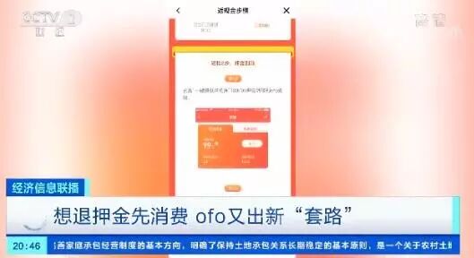 同样是今天,央视还报道了一个新闻,2018年就出现押金难退的OFO共享单车,出了个套路还押金的套路,你要想退押金,还得先消费,返现累计到一定额度,就可以提现了。