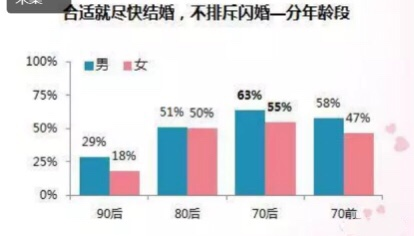 而且,根据某婚恋网站的一份中国婚恋观调查报告显示,在能接受闪婚的群体中,占比最大的不是以「任性、特立独行」著称的90后,而是以70后和70前的为主。