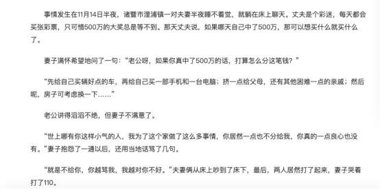 浙江有过一个新闻,两口子因为幻想中了500w,因为怎么分大打出手。