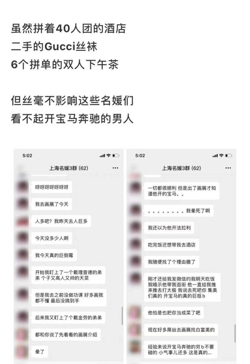 上海集体拼团装名媛的那帮人,其实已经不新鲜了,淘宝上也有相关业务,帮你美化朋友圈,总之,就是装名媛,装白富美。
