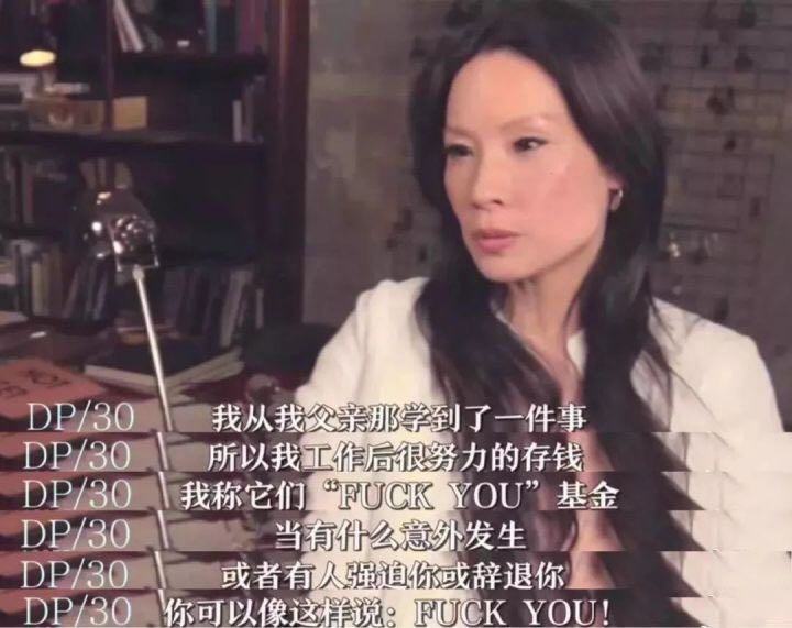 《致命女人》里的刘玉玲提出过一个「Fuck You Money」理论,是她从父亲那里学到的:「所有的事情都是生意,所以我工作后很努力地存钱,我称它为「Fuck You」基金,如果拥有这笔钱,当有什么意外发生,有人强迫你或者辞退你,你就可以对他们说「Fuck You」。」