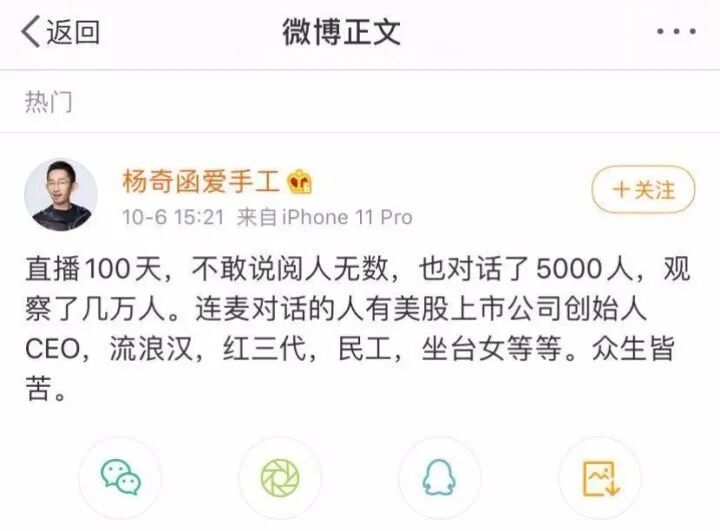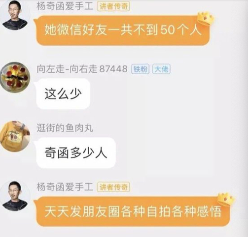 然后女生还有其他人设,北师大高学历,体重不过百,朋友圈只有50人,这三点可以说,满足了很多男人的想象。但是这不是关键。最关键的一点是,杨奇函确认了一点,女生很有钱,而且据粉丝统计,女生前后在杨奇函身上花了20多万。