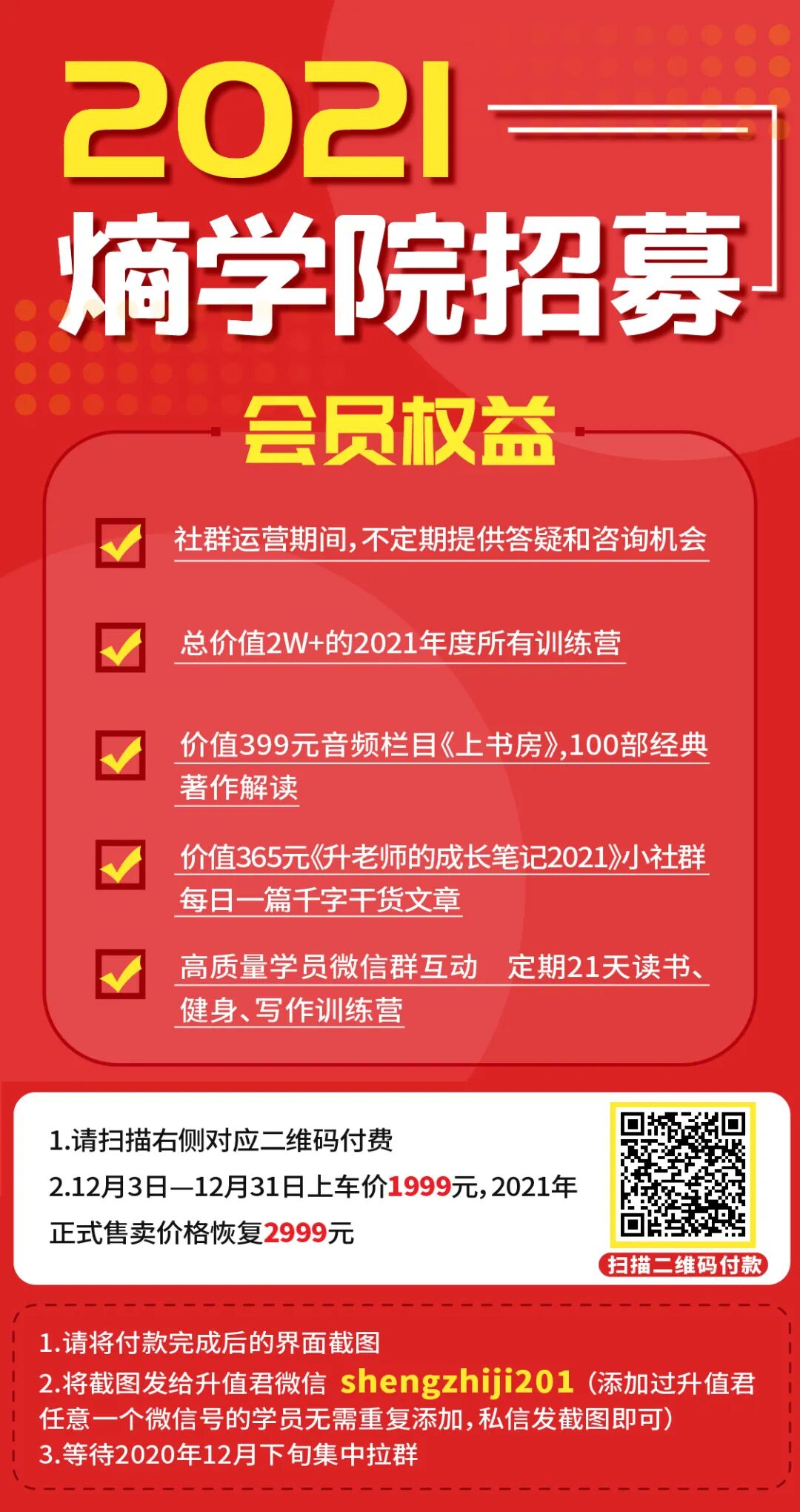 眼看着到年底了,升值君的社群《熵学院》2021年的会员开始招募很久了,明年定价2999元,12月3日—12月31日上车价格是1999元,保留到月底,明年恢复原价。