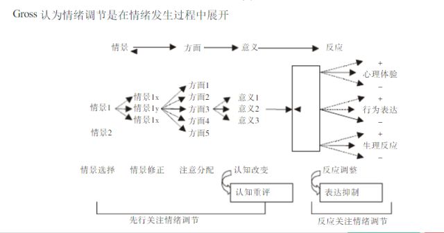 依据Gross的情绪调节过程模型,在情绪发生过程每一个阶段都会产生情绪调节,即情景选择(situation selection)、情景修正(situation modification)、注意分配(attentional deployment )、认知改变(cognitive change)、反应调整(response modulation)。