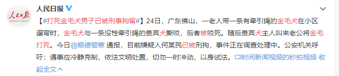 24日,广东佛山,一老人带一条有牵引绳的金毛犬在小区遛弯时,金毛犬与一条没栓牵引绳的贵宾犬撕咬,后者被咬死。随后贵宾犬主人叫来老公将金毛打死。