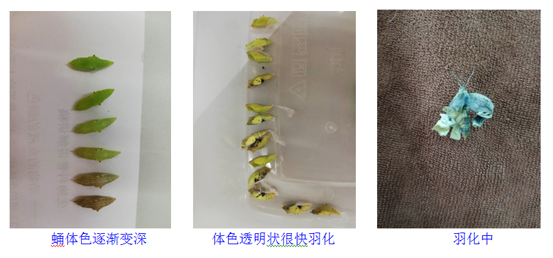 蛹期约10天,由最初的青绿色逐渐变成灰褐色,最后变成半透明,隐约可以看见成虫的体色。