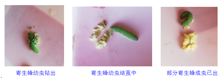 有时也会看到有部分的幼虫宝贝身体钻出很多寄生蜂——菜粉蝶绒茧蜂的幼虫。绒茧蜂将它的卵产在1至3龄的纹白蝶幼虫体内,当它的幼虫在孵出后,直接取食纹白蝶幼虫体内的体液,老熟后多从气门上线和气门下线之间钻出,然后就在一旁结茧化蛹。