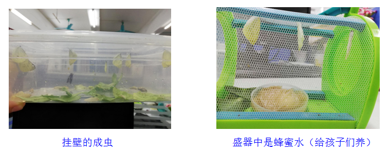 幸好纹白蝶很多的幼虫顺利成为成虫。小罗老师并没有放飞我的宝贝们,毕竟我们算是害虫。虽然我们的成虫期只有5天左右,但是我们每只雌虫的产卵量约有200粒左右,也算危害较大的。她将羽化的成虫放到饲养盒里,分给了小朋友,并教会他们用蜂蜜水喂养,并叮嘱他们如果成虫死亡,不要难过,这是所有生物必经的阶段。到时带回来,再教他们做标本,以另一种方式延续生命。