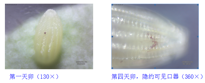 腹中的卵细胞发育成熟并受精后,我就要把他们产在十字花科植物上了,为的是孩子们出生后容易找到食物。为了不受瞩目,我大多数会在叶的背面隔一段距离产一个卵。卵呈炮弹状,表面有许多纵横列的脊纹,形成长方形的小格,直径约0.6mm、高1.3mm,淡黄色,是一件完美的艺术品。