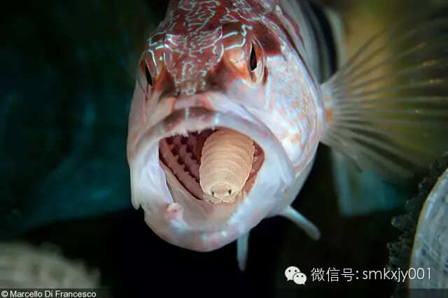鱼嘴中的缩头鱼虱(Cymothoa exigua)图片:Marcello Di Francesco