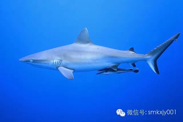 两条鮣鱼(Echeneis naucrates)正在搭黑尾真鲨(Carcharhinus amblyrhynchos)的顺风车。图片:shutterstock.com