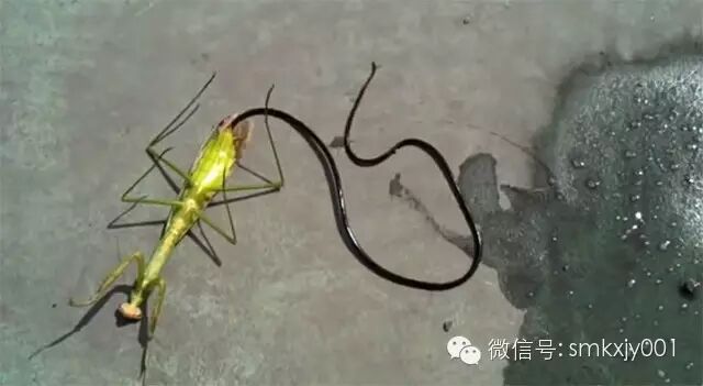从螳螂体内钻出的铁线虫。图片:Hoffinton Post