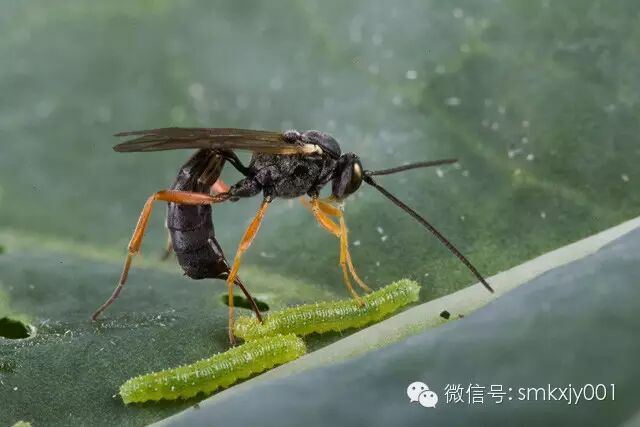菜粉蝶镶颚姬蜂(Hyposoter ebeninus)正在菜粉蝶(Pieris rapae)幼虫身上产卵。姬蜂在毛虫体内孵化后,将以这些菜粉蝶幼虫为食,直至成熟,“破虫而出”。图片:phys.org