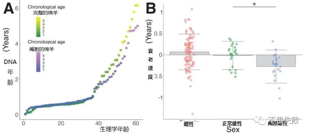 至于男女寿命差距的具体原因,最近的一项科学研究仿佛给出了新的答案:在一项刚刚发表的论文中,新西兰和美国的科学家合作,从内在的衰老——DNA老化的角度研究了这个问题。他们发现,雌性和雄性身上的DNA老化模式很不一样,去势公羊特定部位的DNA分子具有类似于母羊的特征。换句话说,阉割帮助了公羊延缓DNA老化。 通俗的来讲就是,实验表明阉割可以延长寿命。