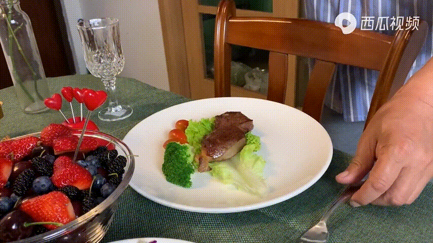 这顿饭,老爹不仅自己煎了牛排,还把炸好的虾认真摆盘,洗好的水果切了才放在碗里。