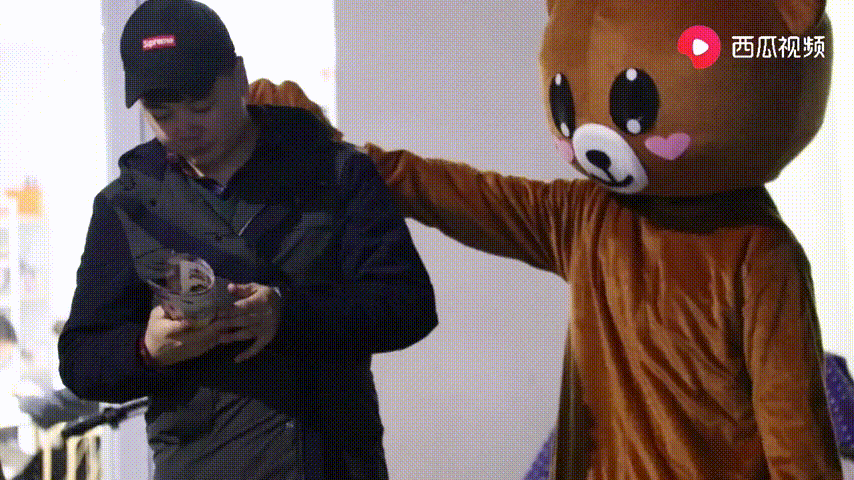 穿着玩偶服的女生,手拿蛋糕走到男友位置附近,却发现刚打电话说自己在和朋友喝酒的男友,正在街边发传单。