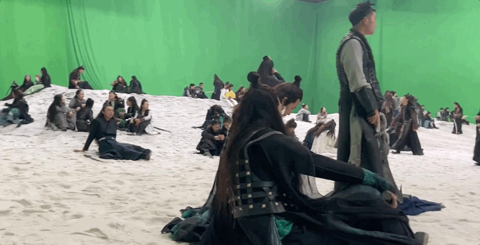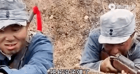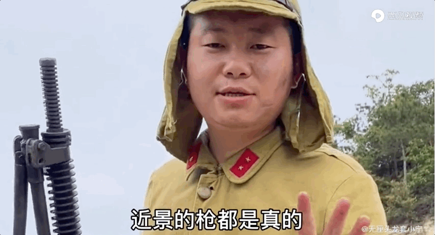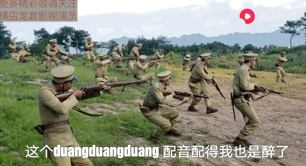 群演站们成两排,端着道具长枪,一边射击一边变阵,认真又投入。但失去了音效和机位加持,这场偷拍的、伴着执行导演高喊“走位!走位”的激烈“枪战”,令人发笑。