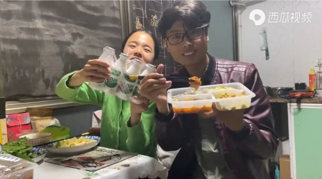 回到家,小朱正在狭窄的厨房里,用简陋的厨具摊着春卷,“再做一道干锅虾”,她手舞足蹈地说。局促的生活和两个年轻人的笑脸,真实地呈现在一条5分钟的视频里。