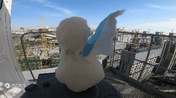 最近于野在西安郊区的一处工地干活,上周末北方大降温,西安也迎来了今年的初雪。他带上安全帽,系上安全绳子登上高空操作室,饶有兴致地堆了一个巴掌大的雪人,用口罩给它做了件超人披风。