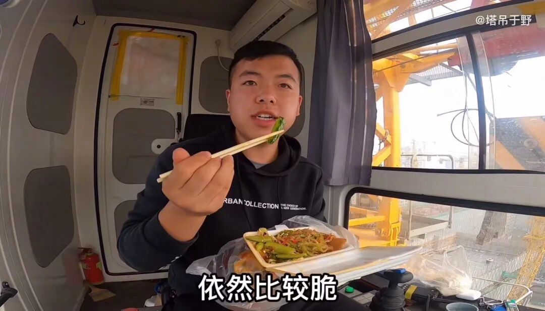 在于野发布的200多个视频里,吃是最重要的主题。他在高空吃过的饭有两个馒头六个菜的工地盒饭、同事亲手做的肉片汤、附近餐馆的新疆米粉……很多人调侃,他这是在拍《舌尖上的塔吊》。